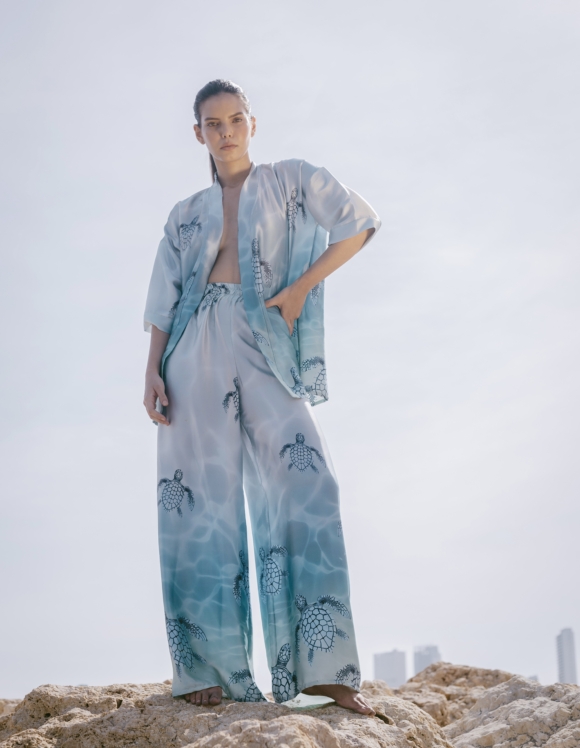 The set includes two pieces: flowing silk pants and a matching kimono jacket. The jacket can be worn as a chic swimwear cover-up or styled separately, while the pants pair beautifully with a silk top, bikini, or lightweight blouse. Ideal for daytime, beachside, or casual summer wear, this set is part of our exclusive La Collection Vita creations — the Turtles design, one of the five original patterns that define our signature luxury resort style.