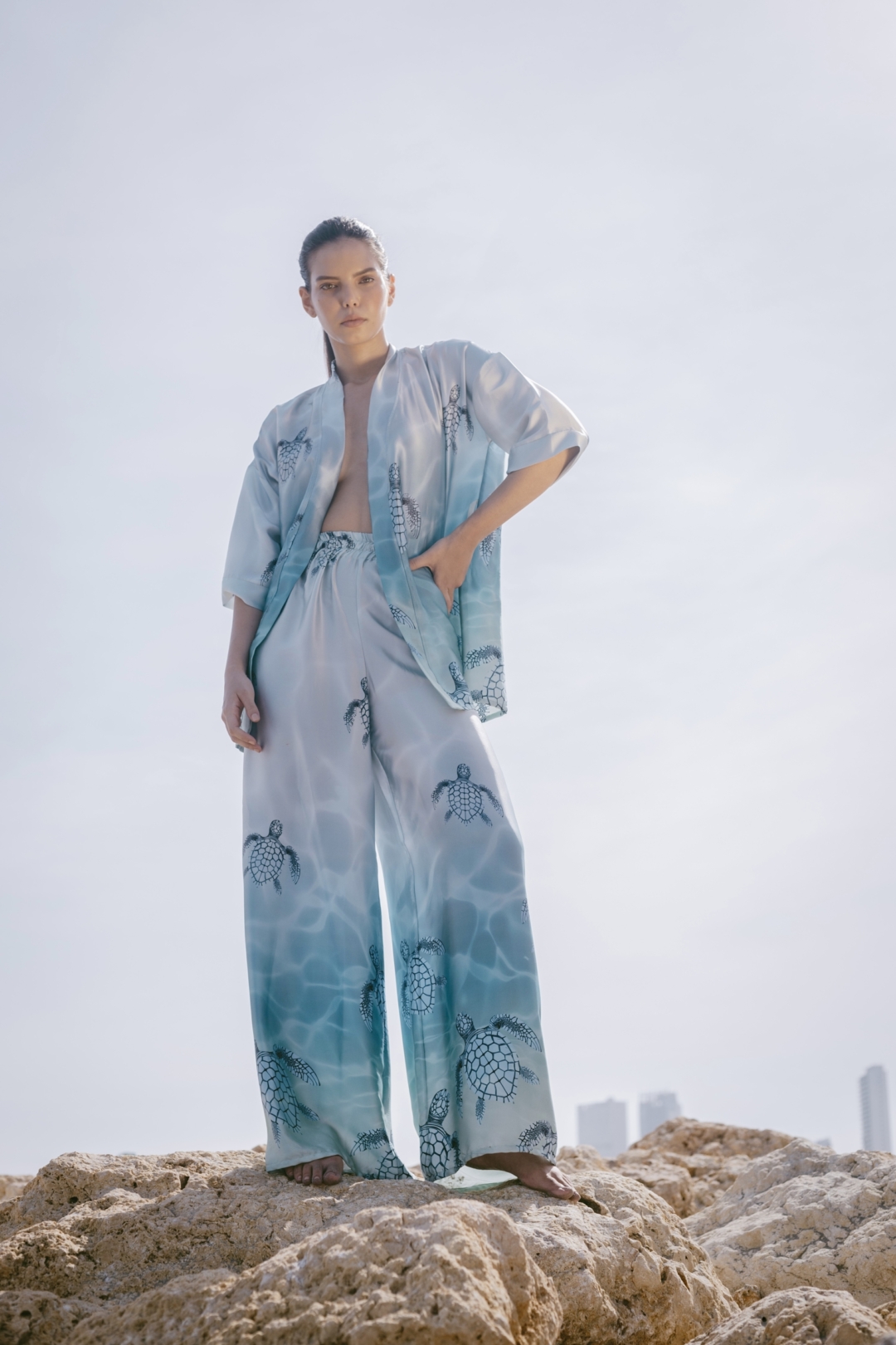 La Collection Vita Silk Set Turtles – handmade luxury resort wear designed in the heart of the French Riviera. Crafted from 100% natural silk sourced from Lake Como, Italy — celebrated for its exceptional quality and soft, fluid texture — this lightweight and breathable set offers an elegant, airy silhouette, perfect for your summer vacation, beach getaway, or resort escape.