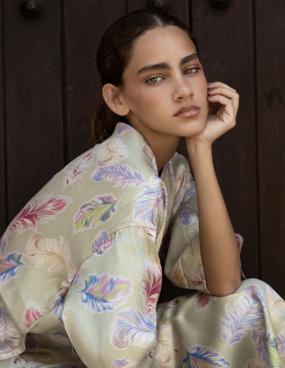 Crafted in silk and enhanced with a touch of gold lurex, the fabric reveals a soft luminosity with a delicate, textured finish. The silhouette is fluid and composed, draping naturally over the body with understated elegance.